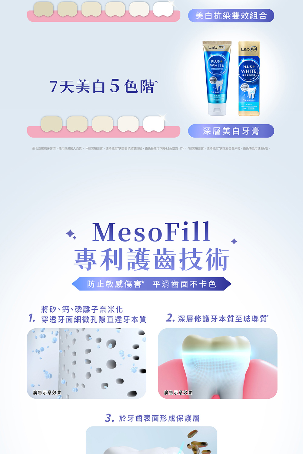 ** MesoFill專利護齒技術,可增加牙齒表面再礦化程度,修護琺瑯質,降低牙齒不適。