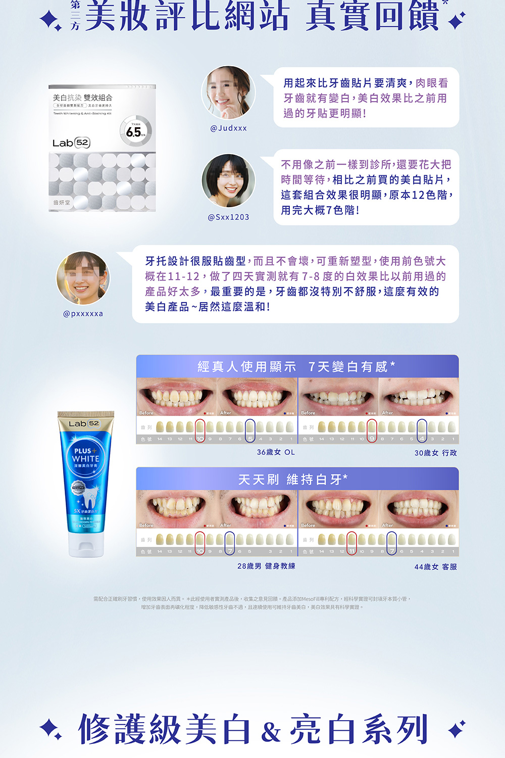 #經實驗證實,連續使用7天美白牙膏組齒色降低可下降5色階,連續使用可維持牙齒美白,美白效果具有科學實證。